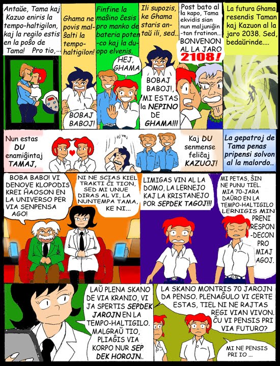 "Ni ĵus revenis de l'futuro!" laŭte proklamas Tama, "Kaj mi portas informon pri kio okazos, mia fratino!"
